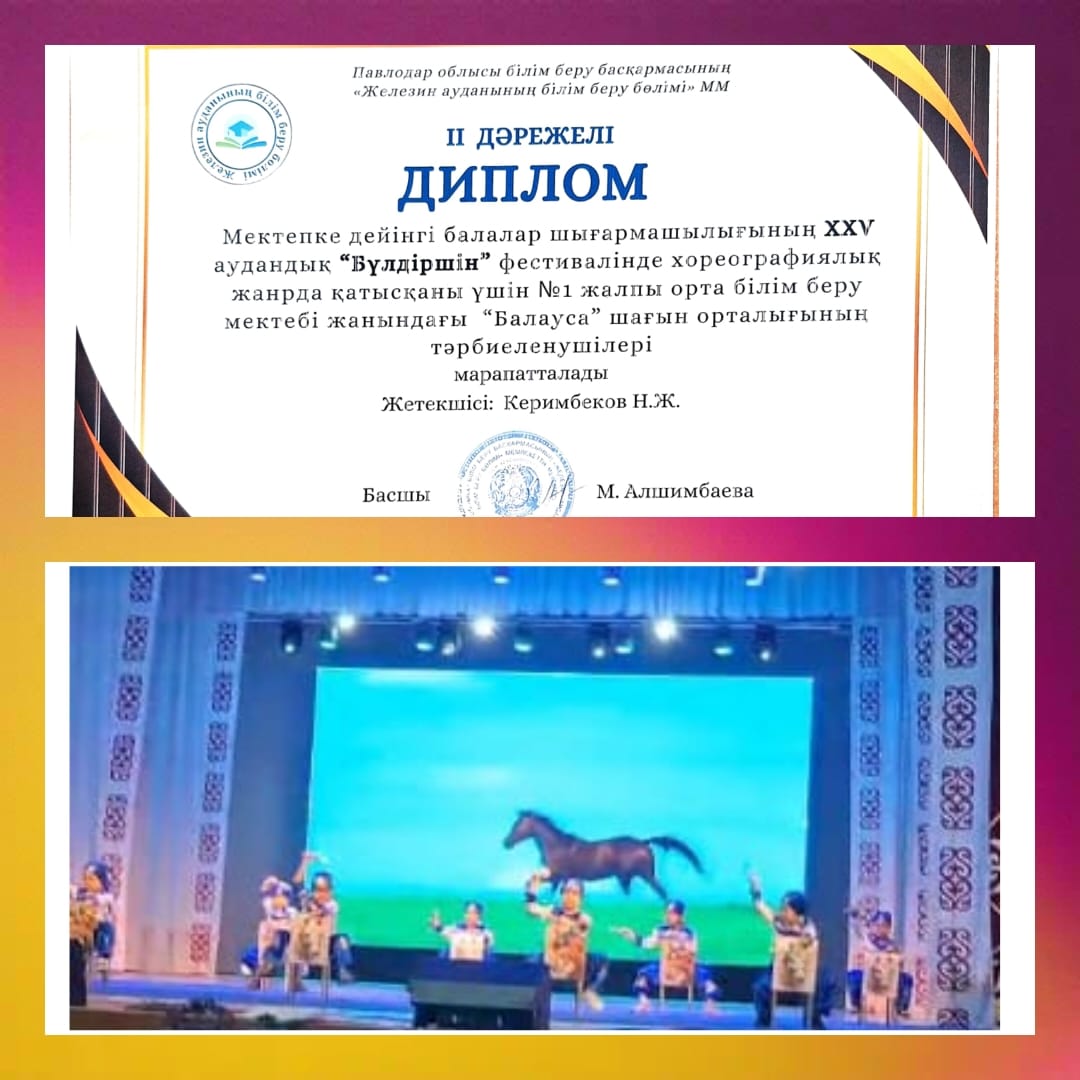Мектепке дейінгі балалар шығармашылығының XXV аудандық "Бүлдіршін" фестивалінде хореографиялық жанрда қатысқаны үшін №1 жалпы орта білім беру мектебі жанындағы "Балауса" шағын орталығының тәрбиеленушілері