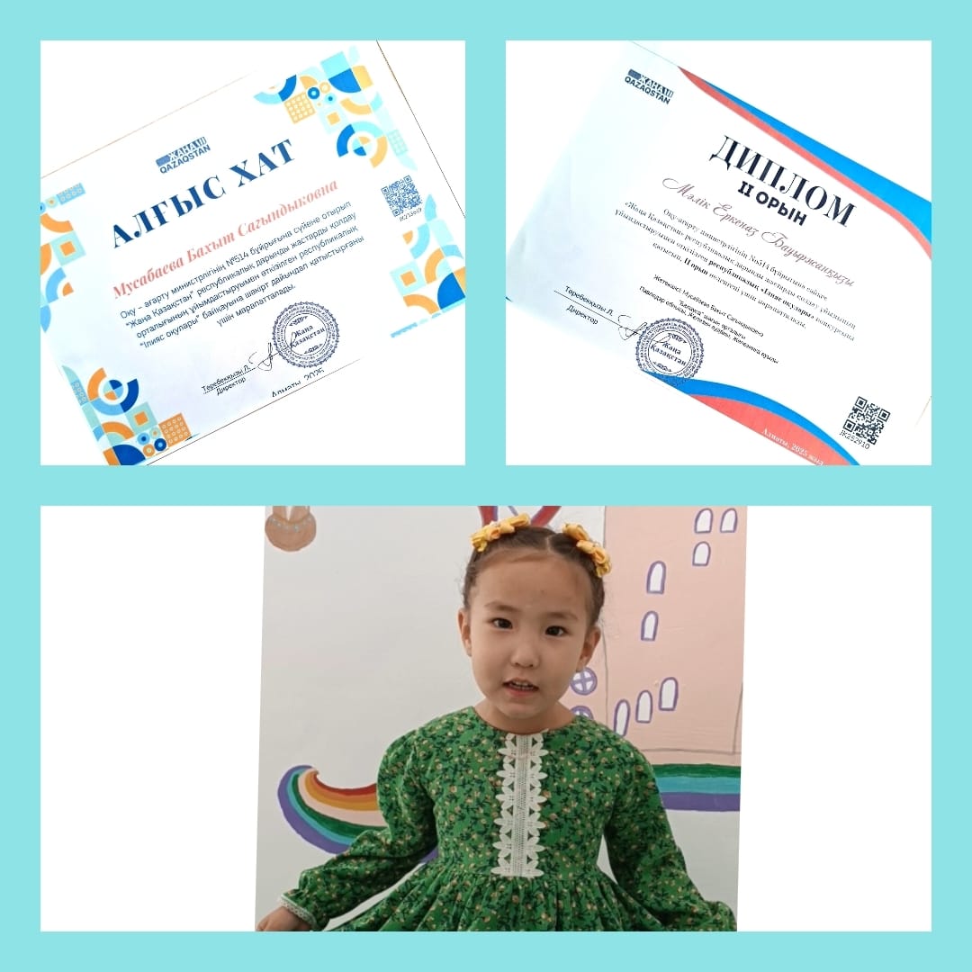 Диплом  ІІ ОРЫН «Жаңа Қазақстан» республикалық дарынды жастарды қолдау ұйымының ұйымдастыруымен өткізілген республикалық «Ілияс оқулары» конкурсының қатысушысы Мәлік Еркеназ Бауыржанқызы