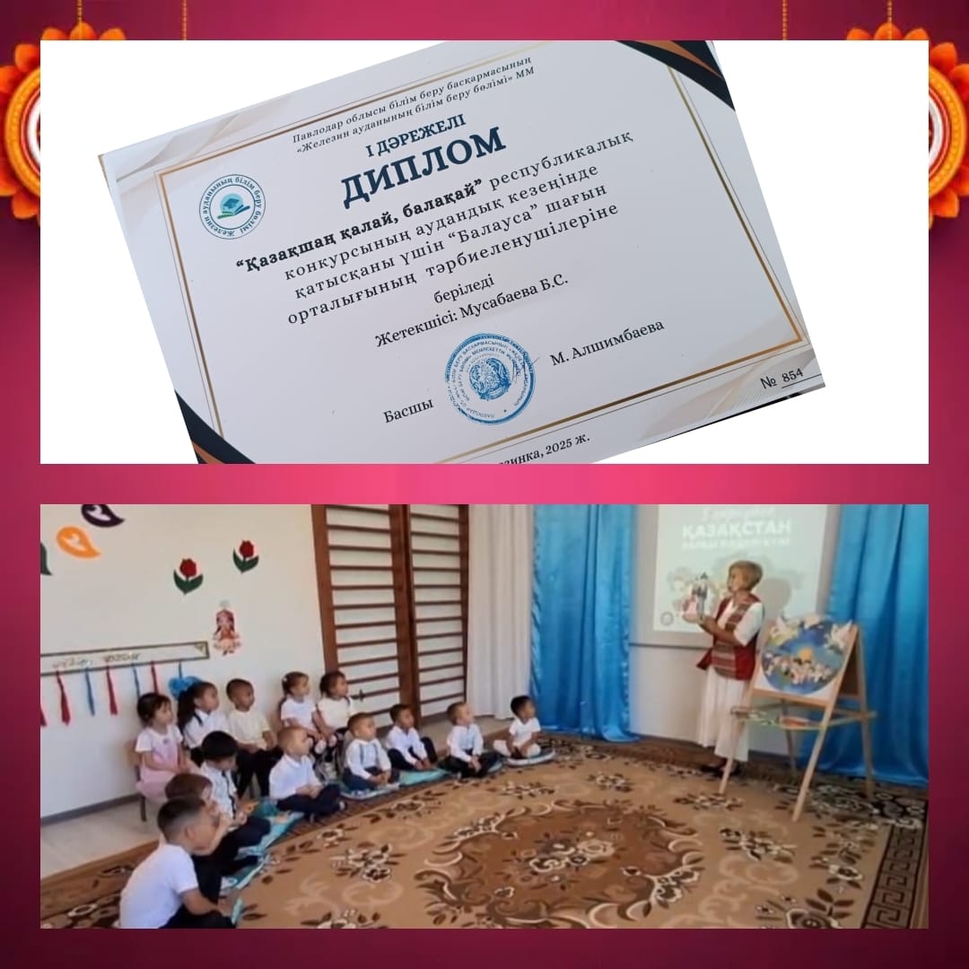 І ДӘРЕЖЕЛІ диплом “Қазақшаң қалай, балақай" Республикалық конкурсының аудандық кезеңінде қатысқаны үшін "Балауса" шағын орталығының тәрбиеленушілеріне